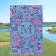 This customizable ladies golf towel features a pink and blue pattern adapted from a William Morris design, with a personalizable monogram. It's a stylish accessory that would be a good gift for any woman who plays golf.