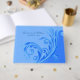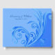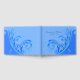 Pretty blue wedding guest book with a darker blue ornate flourish. Personalize the text fields for your special day.