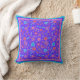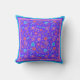 A pretty, floral throw pillow or scatter cushion, with a pattern of bright flowers in purple, turquoise, pink and orange on a royal blue background from a handpainted paper collage by Judy Adamson. You can easily change the background colour by using the Edit button.