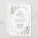 Invite friends and family in style and set the tone for your special day with this charming birthday invitation. Design features blue and white watercolor flowers, greenery, gold confetti and gold frame on white background.