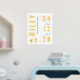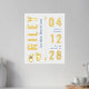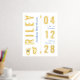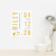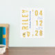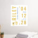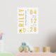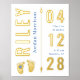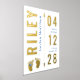 Gold foil nursery poster with your son's birth stats, the date of his birth, time and city, and his name, all in gold foil with a cute pair of baby feet with a blue heart against a white background.