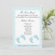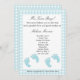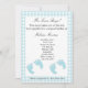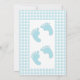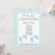 This cute invitation is perfect for sprinkle showering the woman having twin boys. It's background blue and white checks. It shows cartoon baby footprints, both sets in blue. You can customize all the text.