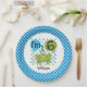 Blue Frog 6th Birthday paper plates are fun, colourful, great for kids who love frogs! Features a cute green frog wearing a polka dotted party hat, green and blue dots, balloons of blue and green that read I'm 6, and a wide border of blue on blue polka dots. You can easily add the sixth birthday child's name to personalize these frog theme paper plates. Look for the matching napkins, T-shirts, buttons, bags, and more!