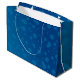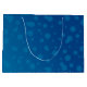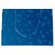 Blue gift bag with white polka dots, featuring white handles. The bag is slightly open, tilted at an angle, conveying a festive, cheerful tone.