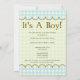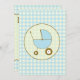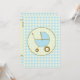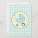 An invitation featuring a blue gingham background over warm beige with brown trim. Personalize the brown font text with details of your event. Opposite side is solid gingham with a blue baby carriage inside a matching circle shaped frame.