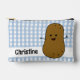 Adorable toiletry bag featuring a cute happy cartoon brown potato. The background is a cute classic pattern of blue and white gingham. A template to add your name to personalize.