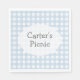 Cute blue and white gingham picnic print napkins with custom name for birthday parties or baby showers.