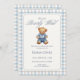 This blue gingham teddy bear baby shower invitation features a classic storybook-style teddy bear dressed in a soft blue outfit, framed by a timeless blue and beige gingham border. The elegant script “We Can Bearly Wait” creates a calm, traditional feel perfect for welcoming a baby boy.