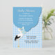 Stylish baby boy shower invitation done in a baby blue and white gingham check pattern and cute graphics of a stork holding a baby bundle. Personalize the white and black text for your baby shower event. Lovely invitation the mom-to-be will cherish.