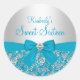 Sweet Sixteen sticker. Blue glitter & Bow. Exclusive Zazzle. Customize with your own details. PLEASE NOTE all flat images! They Do NOT have real Bows, Glitter or Jewels!!