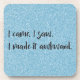 Protect tabletops or furniture surfaces with a Blue Glitter "I made it awkward" Plastic Coaster. Coaster design features the text "I came. I saw. I made it awkward." in a handwritten font against a bright glitter blue background. Additional gift items available with this design as well as a variety of colours.