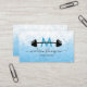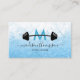 Modern fitness business cards featuring a blue marble & glitter background, a barbell weight silhouette, a signature script, and a professional text template that is easy to personalize. This would be perfect for a personal trainer who works in a gym, or for a self-employed health coach.