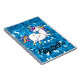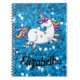 This pretty blue notebook features a chubby little unicorn, leaping for joy over a bed of blue glitter. She has golden hooves and matching gold horn, rainbow coloured hair and tail, gold stars on her body, all on a sparkling blue, shiny background. Please note this cute unicorn notebook can be personalized with your own name.