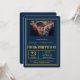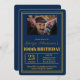 A stylish 100th birthday party invitation. A modern invite in blue and gold. This stylish invitation allows for a custom personalized photograph of the birthday boy! Text in gold coloured effect font and all can be amended to customize to your party requirements, then personalized with a name and date.