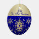 Remember your special day with this beautiful festive navy and royal blue with gold faux glitter (PRINTED) snowflakes round shaped ceramic first Christmas together keepsake ornament that can be customized with the names of the bride and groom, and the year. You can customize the text to say whatever you want and use them as a wedding favour at your winter or Christmas wedding, or as decorations for your venue centerpieces or decor. ****PLEASE be sure your text is placed where you want it, as it will print out as it appears on your monitor. Zazzle will NOT correct anything. It also matches the wedding invitation shown below. If you would like a different shape, or if you need any assistance, please email niteowlstudio@gmail.com.