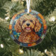 Here's a pretty glass ornament with a stained glass theme, featuring an adorable apricot Poodle dog. The dog is set against a predominantly blue background with a gold border. This makes a nice stocking stuffer or decoration for the household who loves a Poodle.