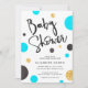 Polka Dot Blue & Gold Baby Shower invitations with "Baby Shower" in friendly handwritten script and big aqua blue, jewelled gold and black polka dots floating around in a chic and fashionable design. Perfect invitations for bright, modern boy baby showers.