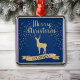 This fancy ornament celebrates the great state of Colorado! It has a faux glitter gold silhouette image of an elk at the centre. Above the elk is the glittery message MERRY CHRISTMAS in script. Below the elk image is a banner with the text in blue COLORADO. Around it all is glittery gold snowflakes. The images and text are placed on a dark blue background. Pretty, and makes a great keepsake!