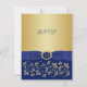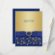 This elegant and modern royal blue and gold floral and scrolled pattern wedding R.S.V.P. card has a PRINTED blue ribbon with a PRINTED blue and gold faux engraved button medallion on it that matches the wedding invitation shown below. All text and the paper choice is customizable. ***PLEASE NOTE there are no raised elements on this invitation. Everything is printed flat.***PLEASE NOTE that if you change the font or size of the font, it may alter how your card prints. It will print the way you see it on your monitor, so if you have alignment issues, or sizing problems, please contact me for help. I will not see your card once you order it, and Zazzle will NOT edit anything (typos, alignment, etc.). If you require assistance with the menu selections, fonts, sizing etc., or if you would like any other matching items, please email your request to niteowlstudio@gmail.com.