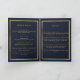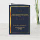 An elegant 4-page program. A dark blue background, a faux gold frame, blue florals and space for your photo on the front. Personalize and add name, dates and your text.
