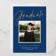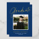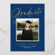 This chic graduation announcement features a colourful blue background (customizable), elegant typography, and one square photo. The beautiful calligraphy script "Graduate" and your student's name are both in raised gold foil! School attended and future school is flat printed in white. This is a chic and elegant design. You can customize this design even further by adding another photo or additional text to the backer. Foil is available in gold, silver, or rose gold and absolutely shines! Select real foil graduation announcements to add the wow factor!