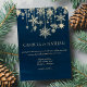 A Navy blue and gold glitter snowflake Christmas winter wonderland wedding invitation is perfect for the holiday season. on a dark midnight navy blue watercolor background featuring a blue, and gold snowflake frame.