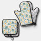 Blue Gold Tea Time Pattern Monogram Oven Mitt & Pot Holder Set
