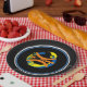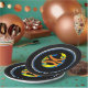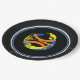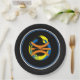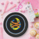 Black rims circle the plate with a Black background and a modern art basketball graphic/logo. Nine inches in size and made of paper. Customize or buy as is.