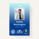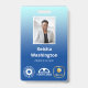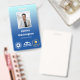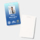 Vertical office employee badge with a simple design against a gradient from pale blue to sky blue. Add a photo of the employee along with name and profession. Personalize further with three business logos.