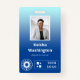 Vertical office employee badge with a simple design against a gradient from pale blue to sky blue. Add a photo of the employee along with name and profession. Personalize further with two business logos.