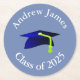 Round Paper Coaster featuring a blue graduation cap (class of 2025) personalize it with a name now; it comes with curved text in white . You can change the colour of the background and the text.