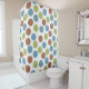 This shower curtain has a geometric design of blue, green, and brown dots.
