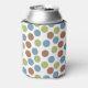 This can cooler has a geometric design of blue, green, and brown dots.