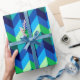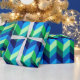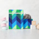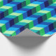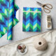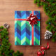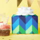 A roll of wrapping paper featuring a colourful, ombre pattern design of chevrons in lime green, royal turquoise, ocean blue and sky blue.