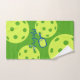 Personalized Pickleball Hand Towel for Sweat printed with custom name or text in a fun and funky feminine script font with a simple pickleball paddle monogram and pickleball ball background in bright yellow green, and blue makes a perfect gift, party favour, or as matching team gear. Use Zazzle's customization options to create a towel in any colour or design with the pickleball artwork elements and font options with custom text and wording.