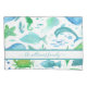 Under the sea, ocean theme. A chic white background with a watercolored pattern of marine life, fish, dolphins, a whale, turtle, seahorse, jellyfish in green, blue and teal. Perfect for a beach house/cottage or summer home. Personalize and add your first name or family name. The name is written with a blue green hand lettered script with swashes. To keep the swashes only delete the sample name, leave the spaces or emoji's in front and after the name.