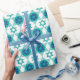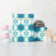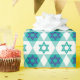 This festive wrapping paper is designed for Jewish holidays and celebrations, featuring a Star of David pattern in vibrant blue and green tones. The stars are arranged on a crisp white background, adding a fresh, colourful touch perfect for Hanukkah, Bar or Bat Mitzvahs, and other special occasions. This wrap combines tradition with a modern, cheerful style.