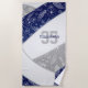 This fun volleyball themed beach towel for her features the realistic image of an abstractly oversized volleyball that has navy blue, grey and white panels - a continuous doodle pattern of paisleys, flowers and feathers in white covers the volleyball's blue and grey panels - personalize with the athlete's name and monogram, varsity letter or jersey number - by katz_d_zynes