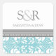 Custom monogram envelope seals for wedding, in elegant bright aqua blue, grey and white classic floral damask vintage pattern, the perfect addition to your save the date card or wedding invitation envelopes, available in many matching wedding products. Contact us for a colour change request.