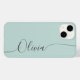 Blue Grey Elegant Calligraphy Script Custom Personalized Name iPhone 14 Smart Phone Cases features a modern and trendy simple and stylish design with your personalized name in elegant hand written calligraphy script typography on a opal blue background. Designed by ©Evco Studio www.zazzle.com/store/evcostudio