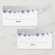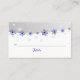 Blue, silver grey, white snowflake wedding escort place card, featuring stars and elegant blue snowflakes on grey. Text in blue and grey. A stylish design perfect for your winter, December or Christmas wedding. Modern and contemporary yet suitable for a traditional wedding.