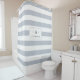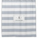 Chic striped shower curtain in light grey-blue and white features a centre element bearing your single initial monogram and family name in inky off-black.
