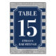 This navy blue and grey striped Bar Mitzvah table number card has a ticket-shaped text area that is trimmed in white, along with white lettering with the name of the Bar Mitzvah at the bottom, below the table number. This table number card is reversible so you can stand it in your centerpieces to be seen from two sides. YOU MUST CHANGE THE NUMBER 15 TO EACH NUMBER YOU NEED, ADD IT TO YOUR CART, THEN RETURN TO THE PRODUCT PAGE AND CHANGE THE NUMBER TO THE NEXT ONE YOU NEED AND SO ON.