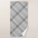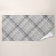 A colourful repeating plaid pattern of diagonal stripes in shades of blue, grey, and tan.