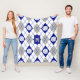 This sporty volleyball team colours fleece blanket features a blue, grey and white argyle plaid pattern with light grey "stitching" extending diagonally across the diamond shapes and white volleyballs overlying the blue diamond shapes - customize with athlete's monogram - by katz_d_zynes