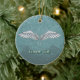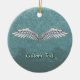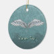 Wide open blue-grey wings illustration. Grunge blue background. Custom text on both sides.
