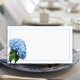 Blank white seating cards with real, light blue hydrangea flower image. The front of each card has a thin line border and light blue solid colour on the back. Hand-write guests names for place cards, and name with table number for escort. Bulk order discounts apply.