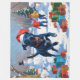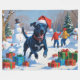 A heartwarming holiday illustration featuring a cheerful dog playing in the snow, wearing a Santa hat and surrounded by colourful gift boxes. In the background, children build a snowman beside a snow-covered Christmas tree, creating a joyful winter wonderland. Perfect for spreading holiday cheer and capturing the magic of Christmas.
