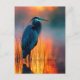 A stunning blue heron standing gracefully in a misty marsh, illuminated by the warm glow of a vivid sunrise.
