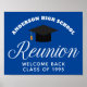 A classic custom class reunion party welcome poster for alumnus in blue and white typography for a high school, college, or university. Customize with your school name and graduating class for great personalized alumni celebration decor.